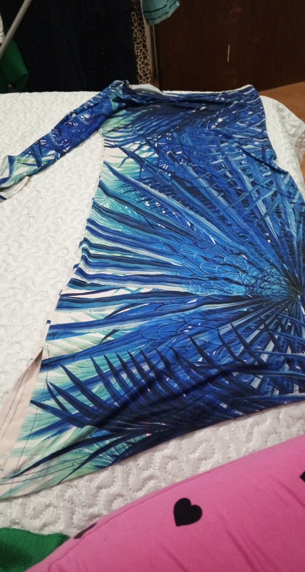 Parlak mavi tie-dye desenli, drapeli, uzun kollu ve straplez, bohem tarzda kadın elbisesi.
