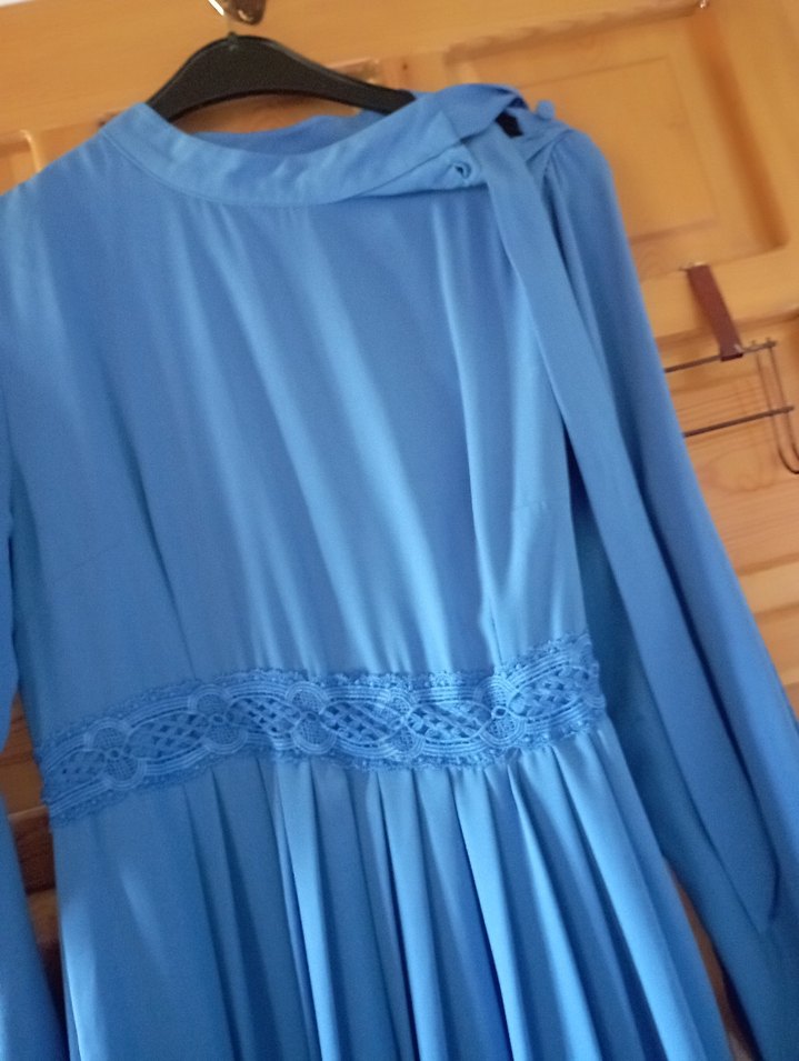 Vintage tarzda mavi uzun elbise, yüksek yakalı ve uzun kolludur. İpeksi kumaştan, bol kesimli, drapeli ve belinde ince dantel detaylıdır, düğün için uygundur. Küçük bir yanık izi var çok belli olmuyor