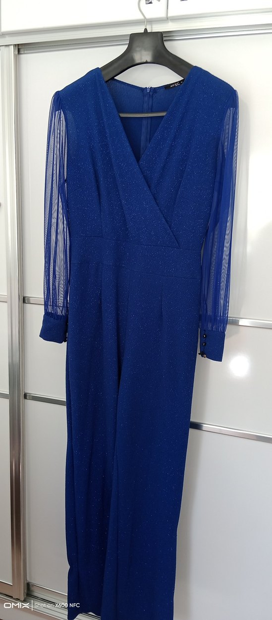 Mavi, uzun kollu, V yakalı ve drapeli tasarıma sahip bu fitted tulum, parlak sentetik kumaştan üretilmiştir ve modern klasik bir görünüm sunar. ✨