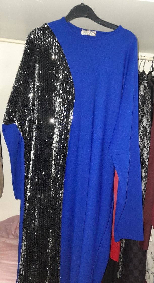 Uzun kollu, mavi tunik; bol kesim, bisiklet yaka ve drapeli tasarımla, parlak pullu desen detayı içerir. Parti için uygundur, sentetik kumaştan yapılmıştır. ✨