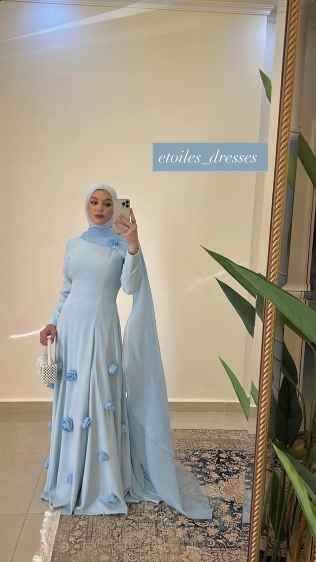 Pastel mavi uzun kollu, yüksek yakalı, drapeli ve çiçek detaylı tesettür abiye. Düğünler için sade ve bohem tarzda, rahat kesim.