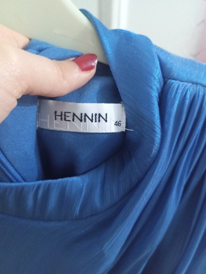 Fitted kesim mavi abiye elbise, tekne yaka ve uzun kolludur. Drapeli detayları ve parlak desenli kumaşıyla, midi boyda ve 46 beden Hennin markadır. bir defa düğünde giyildi paketli.