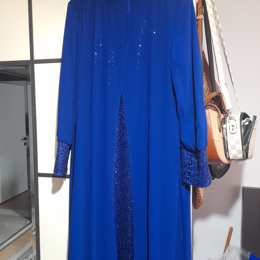 Mavi uzun elbise, ve uzun kollu, detaylı manşetlere sahip. İpeksi kumaştan, drapeli ve parlak görünümlü, romantik akşamlar için uygun. ✨ çok şık zayıf gösterir