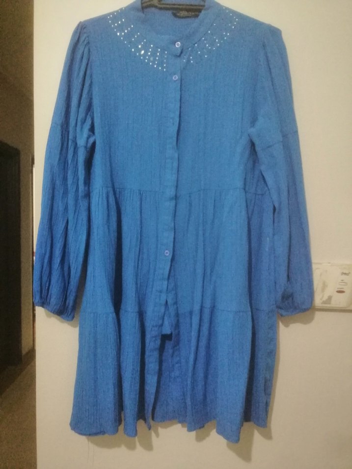 Mavi renkte, ayrobin kumaştan uzun kollu, düğmeli ve yakalı, bol kesim bir tuniktir. Parlak dokusuyla günlük kullanıma uygundur.
