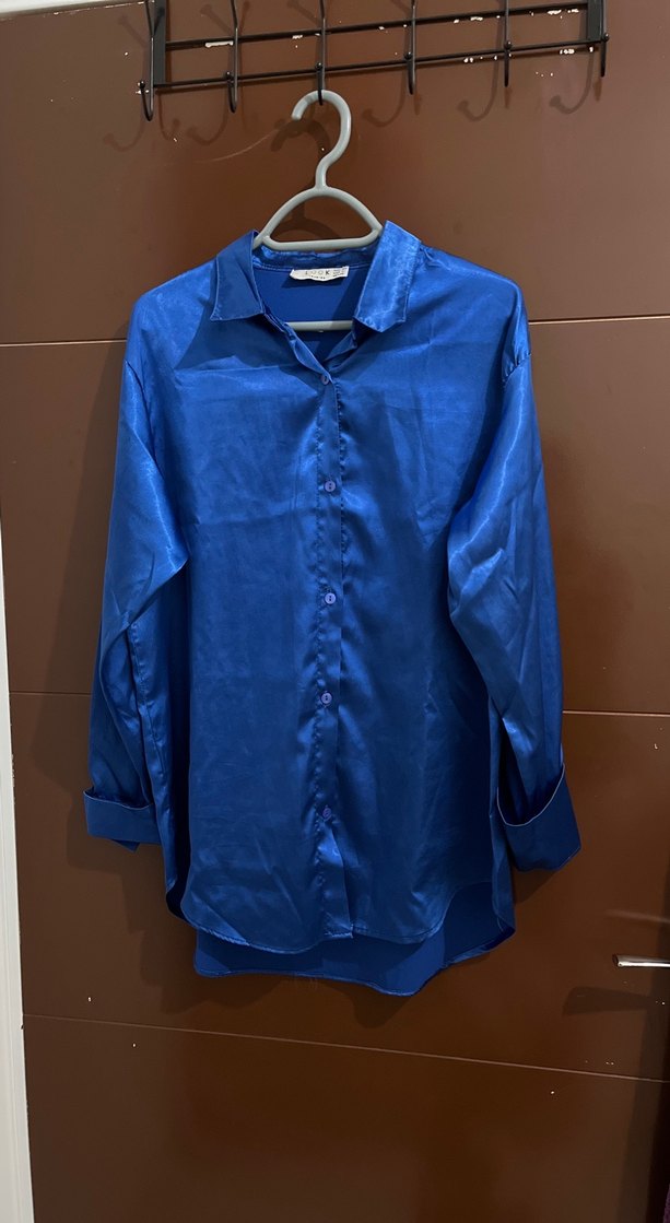 Mavi, parlak ve ipeksi kumaştan, düğmeli, yakalı, uzun kollu, midi boy ve bol kesim kadın gömleği. Günlük rahat stil için uygundur.
