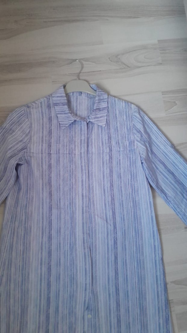 Pastel mavi keten gömlek, yakalı, düğmeli ön, uzun kollu, bol kesim ve midi boydadır. Günlük kullanıma uygundur.