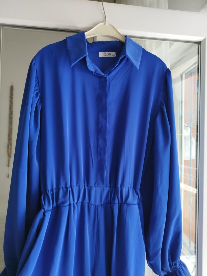 Uzun, bol kesim tulum parlak mavi saten kumaştan, uzun kollu ve yakalıdır. Düğme detaylı, desensiz.