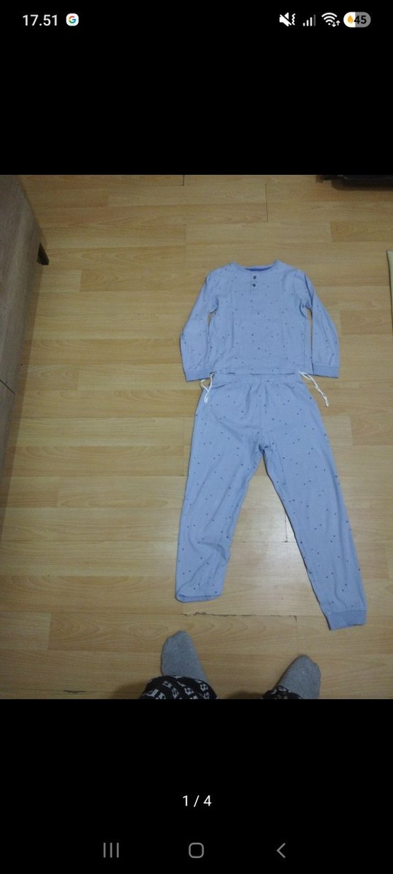 Mavi pastel renkte, uzun kollu erkek çocuk pijama takımı. Normal midi boyda, sade ve rahat yumuşak kumaştan üretilmiştir. 8/10 yaş hm marka temiz Defosuzdur