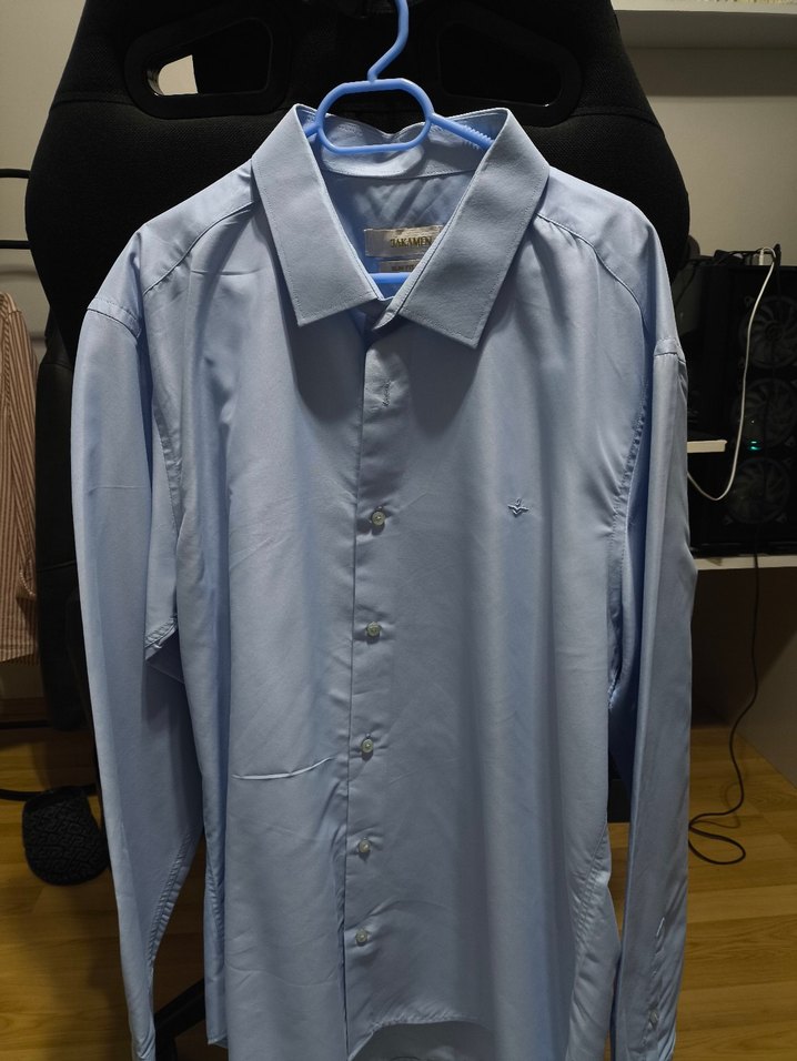 Mavi renkte, düğmeli uzun kollu, regular fit erkek gömlek. Sentetik kumaştan üretilmiş, kolyeli ve normal boyda, iş ve günlük kullanıma uygun.