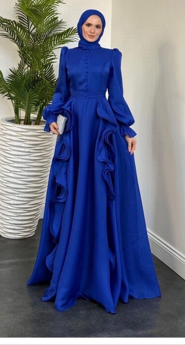 Uzun kollu, yüksek yakalı ve etek kısmında fırfır detaylı mavi abiye elbise. Parlak desenli kumaşıyla düğünler için modern klasik şıklık sunar. ✨