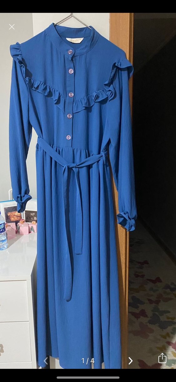 Mavi uzun kollu elbise, fırfır detaylı ve kuşaklıdır. Rahat kesimi ve notched lapel yakasıyla yumuşak sentetik kumaştan yapılmıştır.