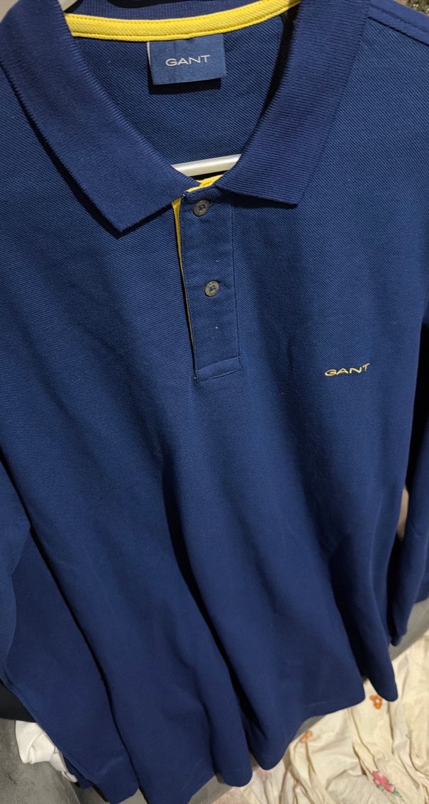 GANT markalı mavi uzun kollu polo tişört, düğmeli ve yakalıdır. Yumuşak pamuk kumaştan yapılmış, bol kesim ve parlak görünüme sahiptir.