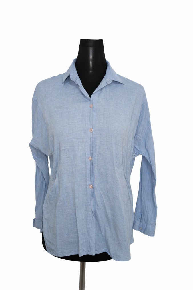 Pastel mavi hafif kumaştan, uzun kollu, yakalı ve düğmeli gömlek. Rahat kesimi ve normal boyu ile günlük kullanıma uygun.