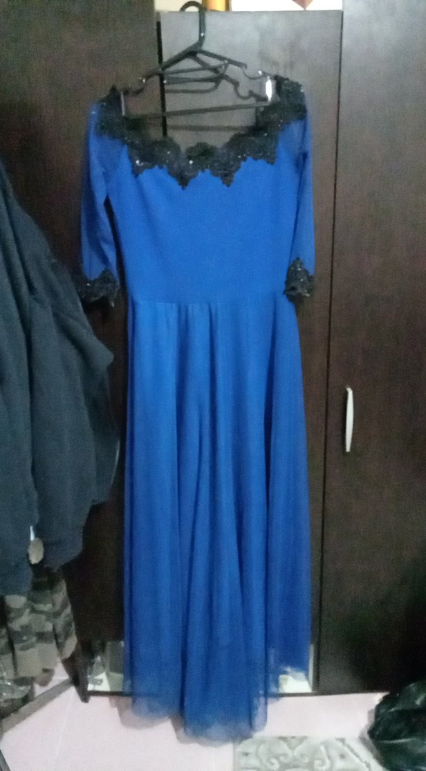 Koyu mavi, uzun kollu, bol kesim kadın elbisesi, kayık yaka ve drapeli tasarıma sahip, siyah dantel detaylı. Düğünler için uygun. sadece bir kere giyildi hiçbir sorunu yok