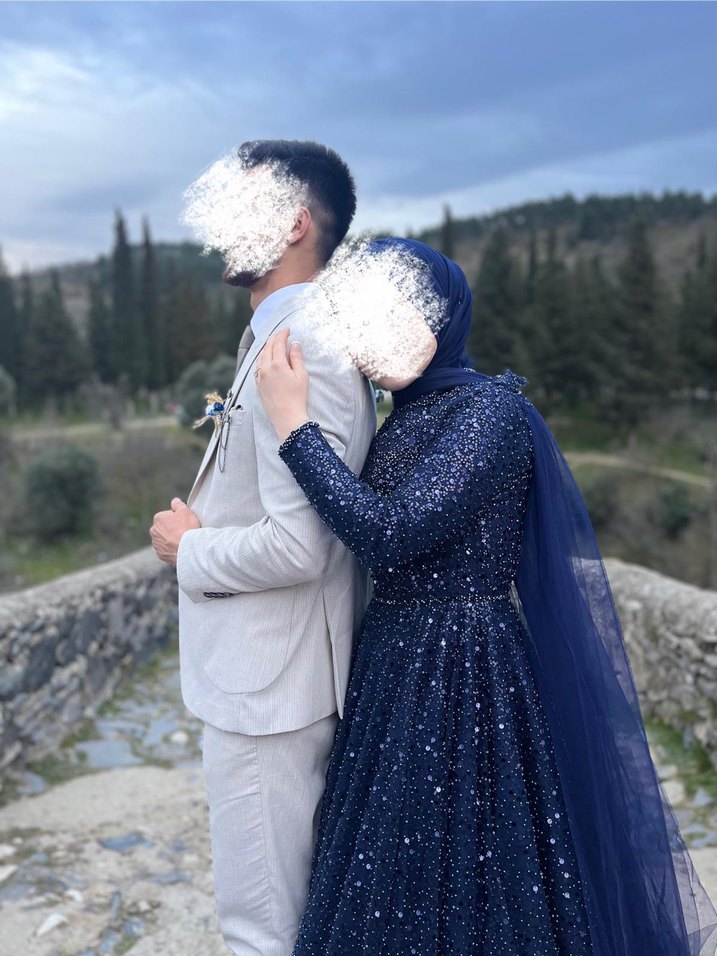 mavi, uzun ve vücuda oturan nişan elbisesi, yüksek yakalı ve full taşlı arkası ipli tarlatanlı kullanılabilir. Hiç bir sorunu yoktur. Tarlatan isteyene hediye gönderilecektir. (160 boy 180 cm de kuyruk)