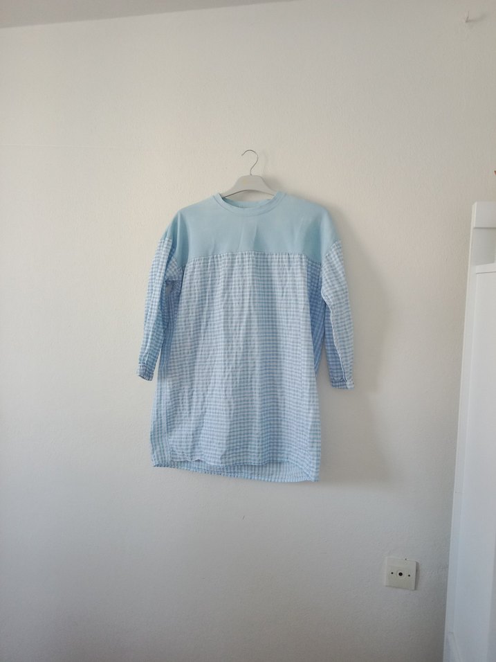 Pamuk kumaştan, uzun kollu ve yuvarlak yakalı, bol kesim mavi hamile gömleği. Minimalist, pastel mavi ve hafif kareli deseniyle rahat bir stil sunar.
