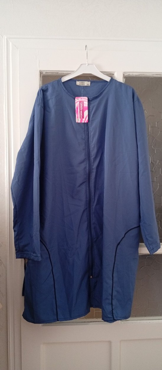 Koyu mavi renkte, uzun kollu ve bol kesim haşemaFermuarlı önü ve kesimli yakası bulunur, sentetik kumaştan üretilmiştir.