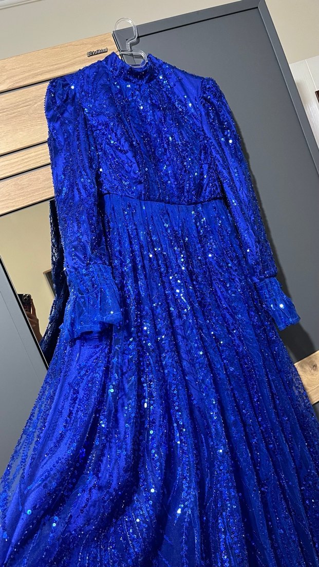 Mavi renkte, uzun kollu ve işlemeli, simli detaylara sahip uzun abiye elbise. Tekstil, klasik şıklık ve parlak görünüm sunar. ✨