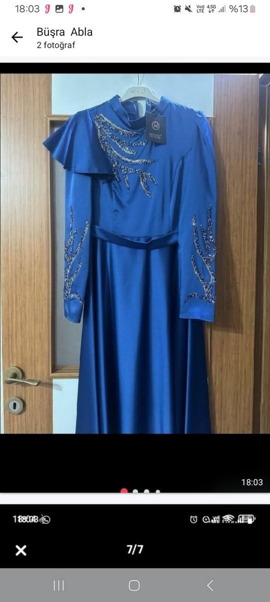 Mavi renkte, drapeli ve işlemeli desenlere sahip uzun kollu abiye elbise. Kayık yaka ve parlak kumaşıyla düğünler için uygun, modest ve şık bir tasarım. ✨şalı dahil