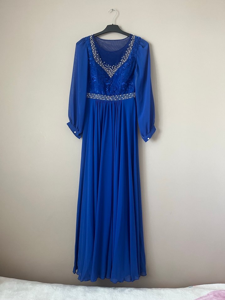 Mavi Uzun Kollu İşlemeli Abiye Elbise