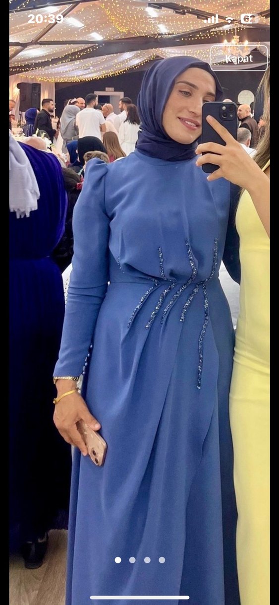 Mavi, işlemeli ve parlak detaylara sahip, uzun kollu, yüksek yakalı ve drapeli, oturan kesim abiye elbise. ✨