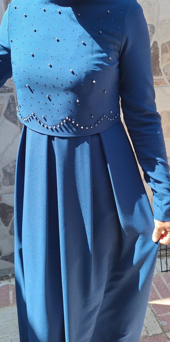 Fıtlı, yüksek yakalı ve uzun kollu bu uzun elbise, parlak mavi sentetik kumaş ve işlemeli detaylara sahiptir. Düğünler için uygundur.