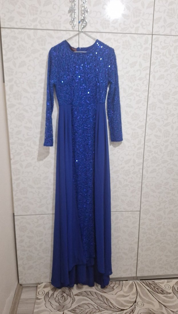 Mavi renkli, uzun kollu ve yuvarlak yakalı elbise. Üst kısmı payetli ve drapeli, modern klasik tarzda, düğünler için uygun herhangi bi defosu falan yok