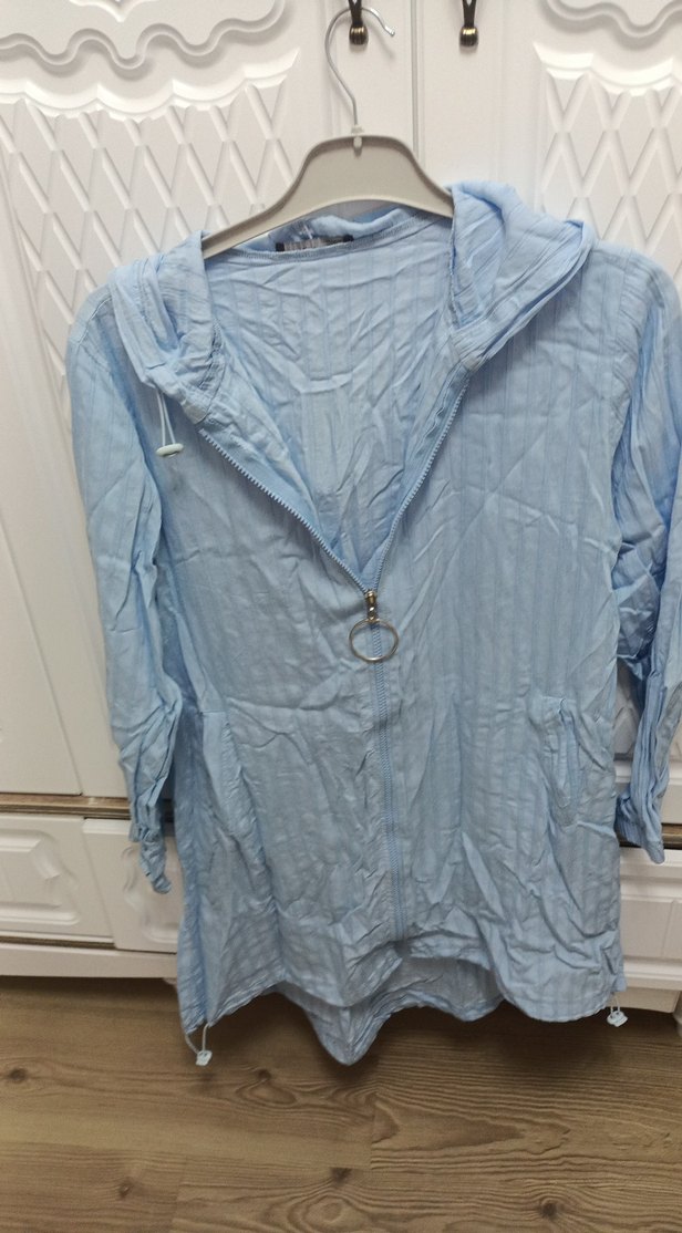 Pastel mavi kumaştan, uzun kollu, yakalı ve düğmeli bol kesim kadın ceketi. Günlük kullanıma uygun rahat stil.