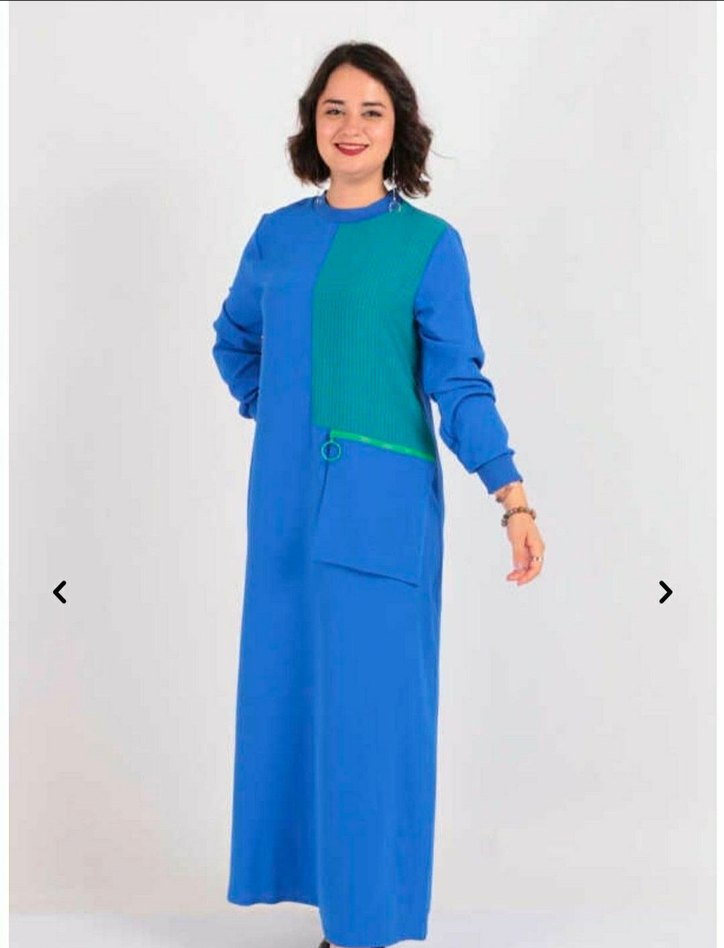 Mavi uzun kollu, bisiklet yaka ve İtalyan ayrobin kumaş kadın elbisesi. Rahat kesimli, yumuşak, günlük kullanım için uygundur. Minimalist ve sade tasarıma sahiptir.