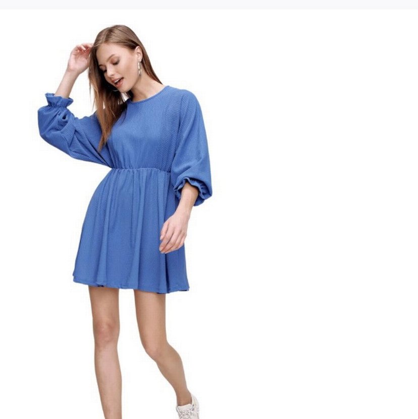 Mavi renkte, uzun kollu, yuvarlak yakalı ve bol kesim midi elbise. Pliseli tasarımı ve denim kumaşıyla gündelik kullanıma uygundur.