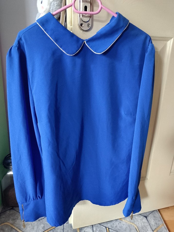 Mavi, yakalı, uzun kollu ve düğmeli kadın gömleği. İpeksi kumaş ve parlak yüzey ofis kullanımı için uygundur. M-L beden uyumludur.