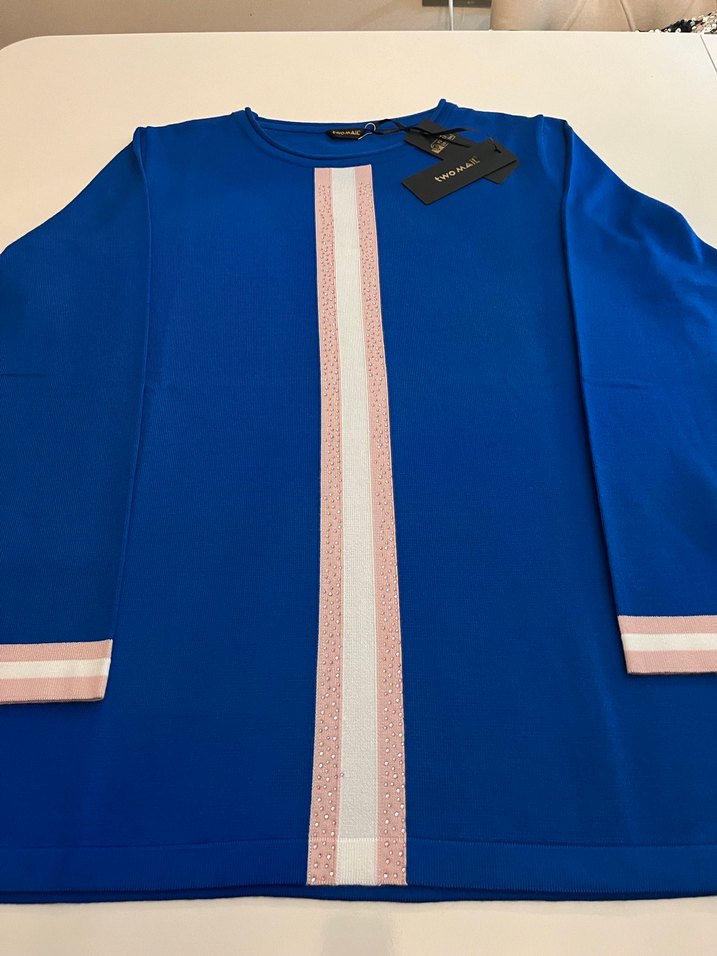 Mavi uzun kollu, yuvarlak yaka ve normal kesim tunik, parlak sentetik kumaştan. Baskılı dikey çizgiler ve kollarda elastik detaylar bulunur, trend günlük sokak stili için uygundur.
