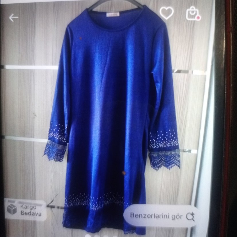 Mavi uzun kollu, bol kesim triko tunik. Yuvarlak yakalı, işlemeli, örgü dokulu ve parlak detaylı, günlük rahat kullanıma uygun.