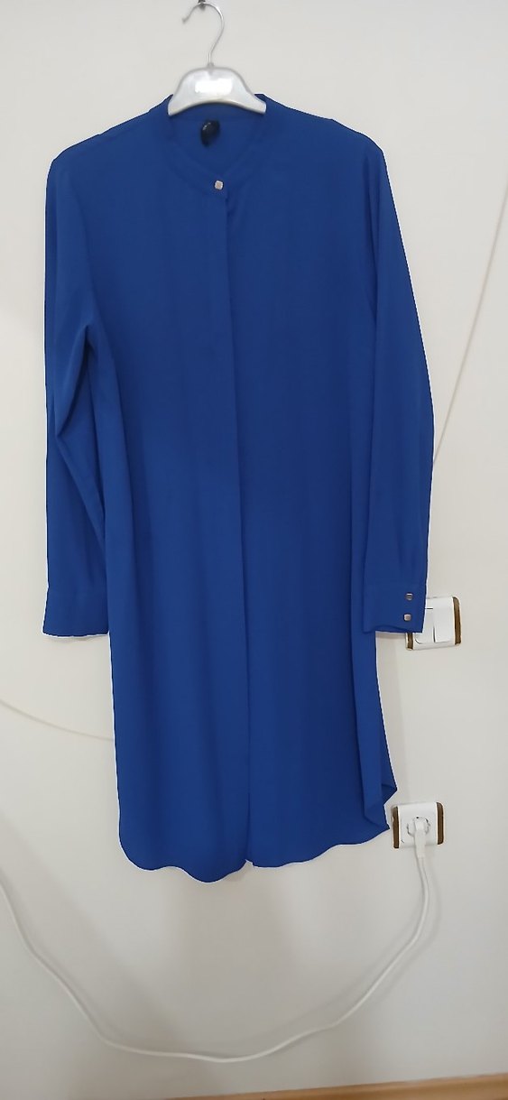 Mavi renkte, uzun kollu ve düğmeli manşetlere sahip kadın tunik. Satenimsi parlak kumaştan, minimalist ve çağdaş tasarım, ofis kullanımı için uygundur.