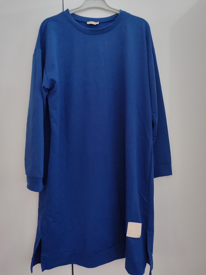 Kadınlar için uzun kollu, yuvarlak yakalı ve bol kesim mavi tunik. Yumuşak ve sıcak kumaştan, günlük ve sokak stiline uygun sade tasarım.