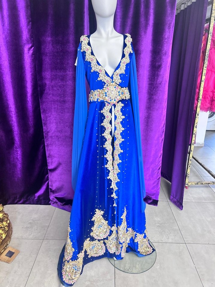 Uzun, bol kesim mavi kına elbisesi, renkli desenler ve derin V yakası ile kına gecesi için uygundur. 38-40 beden giyebilir
