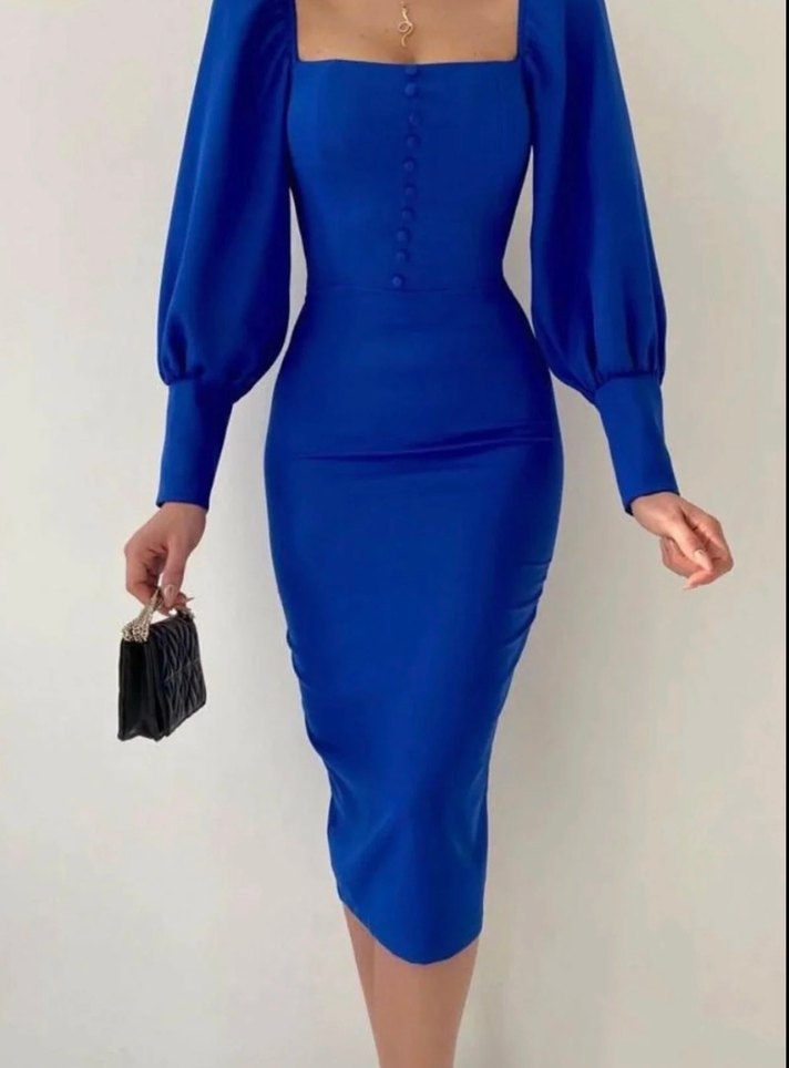 Parlak mavi, uzun kollu, V yaka kalem elbise. Düğme detaylı, ipeksi dokulu ve ofis için uygun modern bir tasarım.