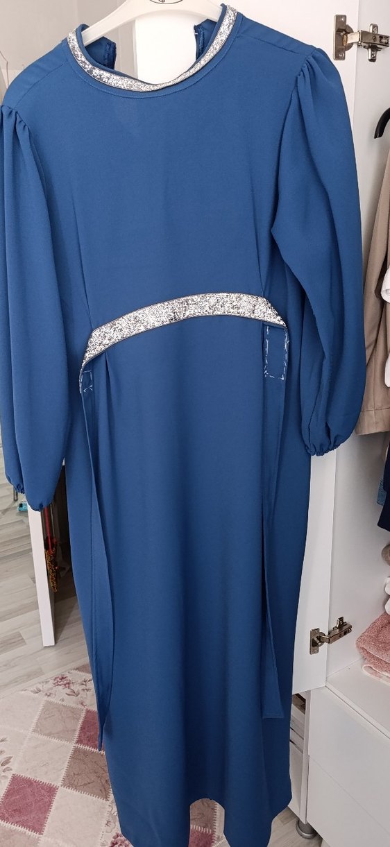 Mavi uzun elbise, yakasında kesik yakalı, ince uzun kollu ve parlak kemerli detaylara sahiptir. Düzenli kesim ve modern, sade bir tarza sahiptir.