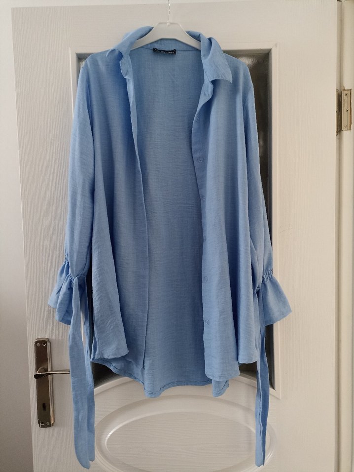 Mavi keten kumaştan, uzun kollu ve salaş kesime sahip, yakalı, drapeli uzun gömlek. Günlük rahat kullanıma uygundur. l xl