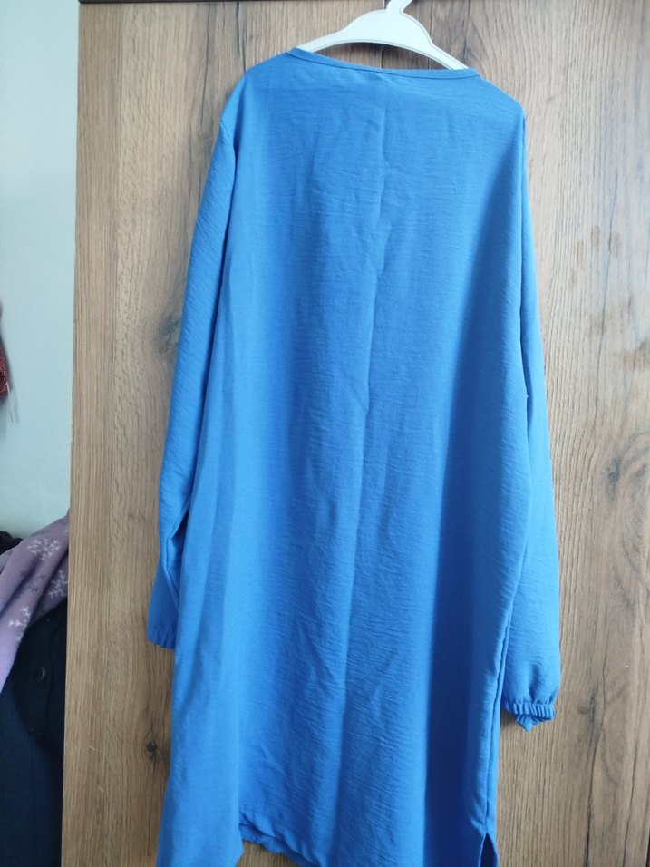 Mavi keten kumaştan, uzun kollu, yuvarlak yakalı ve dökümlü tasarıma sahip bol kesim uzun tunik. Minimalist tarzda, günlük kullanıma uygun.