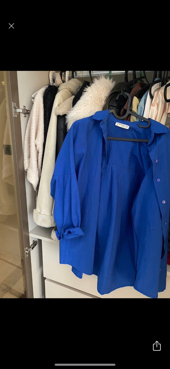 Mavi dokuma kumaştan, düğmeli, yakalı ve uzun kollu, bol kesim midi gömlek. Günlük sokak modasına uygun rahat bir parça.