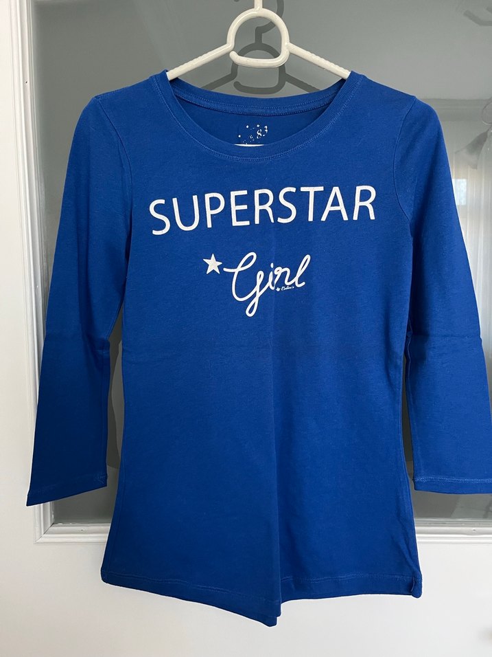 Mavi renk, uzun kollu, pamuk kumaştan, önü parlak baskılı "SUPERSTAR Girl" yazılı, dar kesim, bisiklet yakalı kız tişörtü.