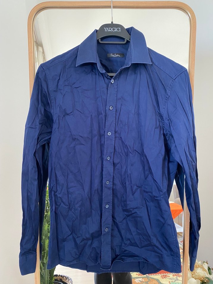 Koyu mavi kumaştan, yakalı ve düğmeli uzun kollu erkek gömlek. Düz ve desen içermeyen, normal midi boyda, regular fit kesim. Ofis ve iş ortamına uygun.