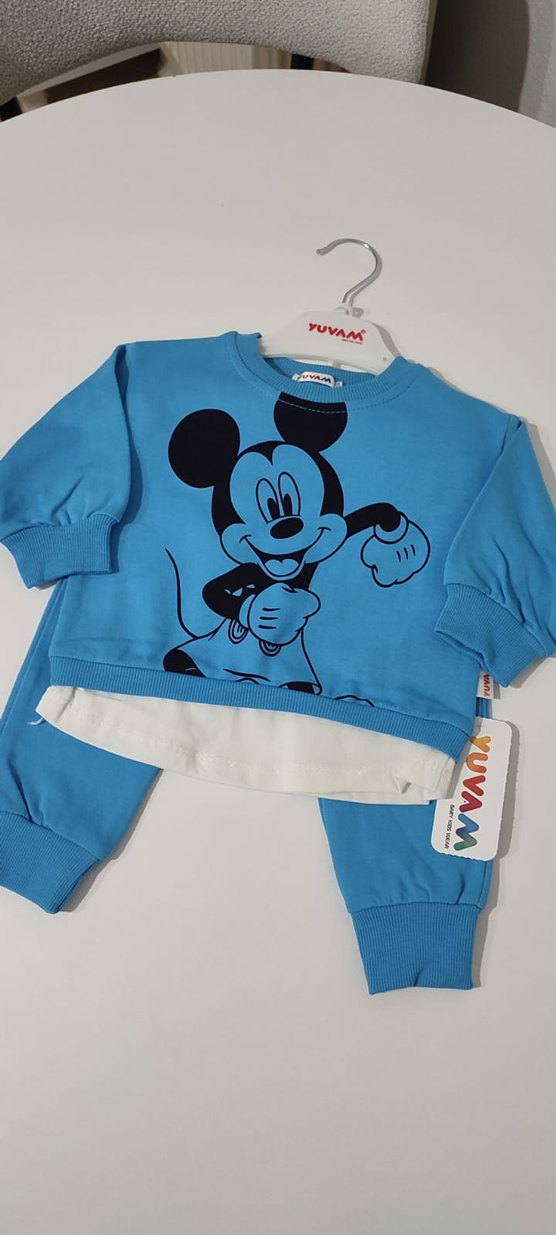 Mavi renkli, uzun kollu bebek takımı. Renkli Mickey baskılı, yuvarlak yaka ve düğmeli detaylara sahip. Yumuşak ve sıcak kumaştan üretilmiştir.
