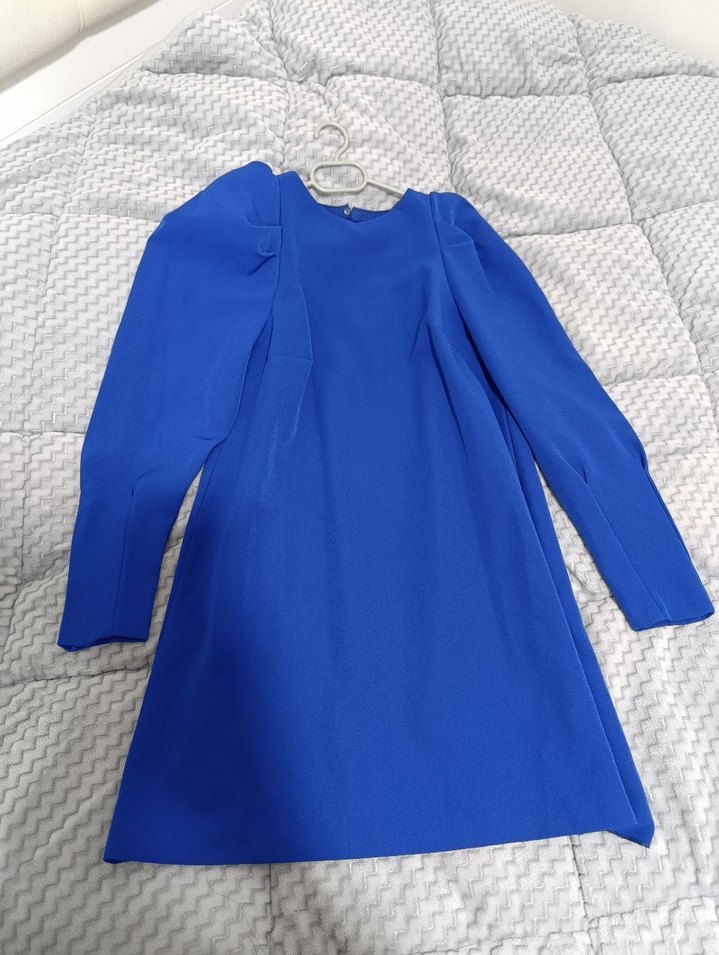 Mavi renkli midi uzun kollu elbise, yumuşak sentetik kumaştan, bol ve drapeli kesime sahip. Minimalist tasarımıyla ofis için uygundur.