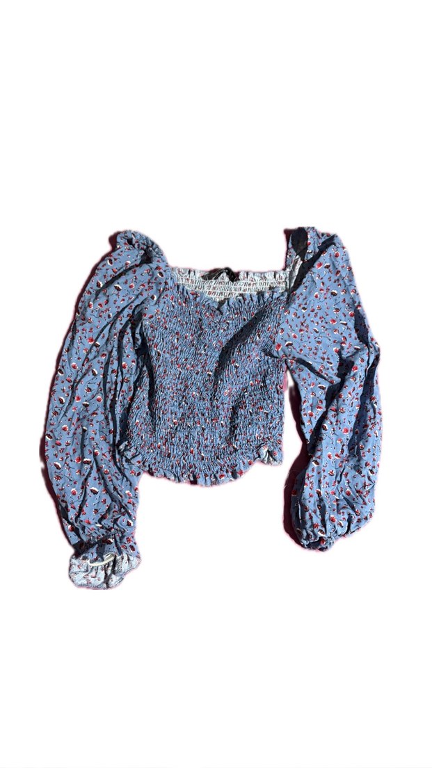 Mavi renkte, uzun kollu, straplez ve dar kesim bluz. Kısa boyu, fırfır detayları ve hafif batik deseniyle günlük sokak stiline uygun.