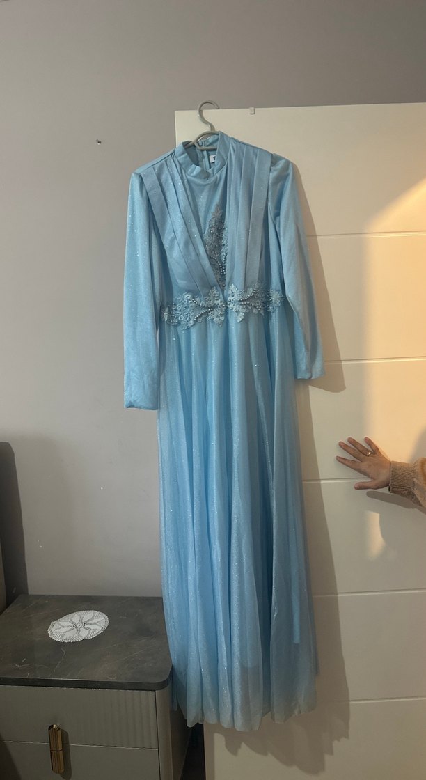 Pastel mavi renkte, nakışlı desenler ve drapeli detaylara sahip uzun, bol kesim abiye elbise. Uzun kollu ve V yakalı, klasik zarafeti yansıtır.