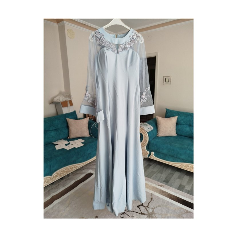 Mavi Uzun Kollu Nakışlı Kadın Elbise