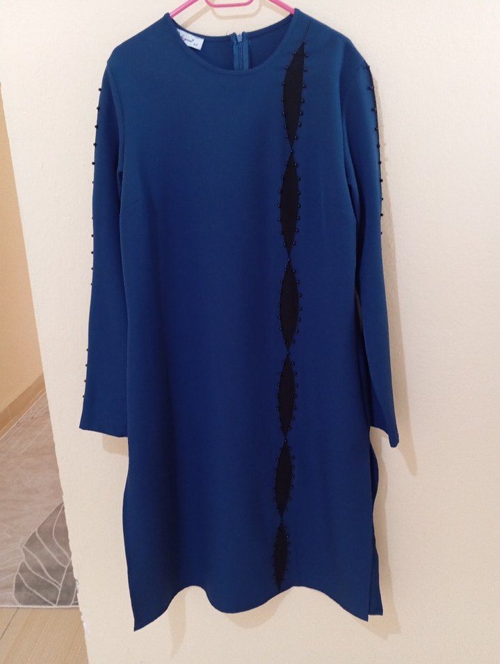 Uzun kollu, yuvarlak yakaya sahip mavi tunik. Nakış detaylı ve yan yırtmaçlı, günlük kullanıma uygun. Ürünün hiçbir sıkıntısı yoktur.
