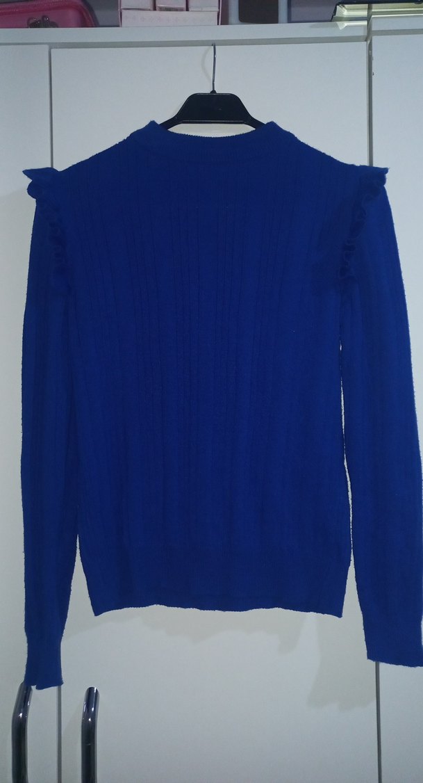 Bu koyu mavi kadın kazak, yuvarlak yaka ve uzun kolludur. Örgü dokusu ve bol kesimiyle rahat bir kullanım sunar. Günlük sokak stiline uygundur.